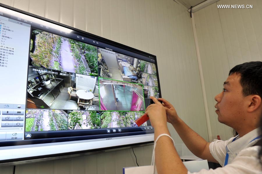 | A staff member explains the interior of the Moon Palace 1 on a series of monitors. (Xinhua/Gong Lei) |