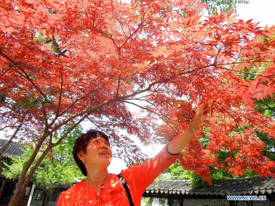 A visitor poses with a Japanese maple tree at the Zhuozhengyuan Garden in Suzhou City, east China's Jiangsu Province, May 22, 2014. (Xinhua/Wang Jiankang)