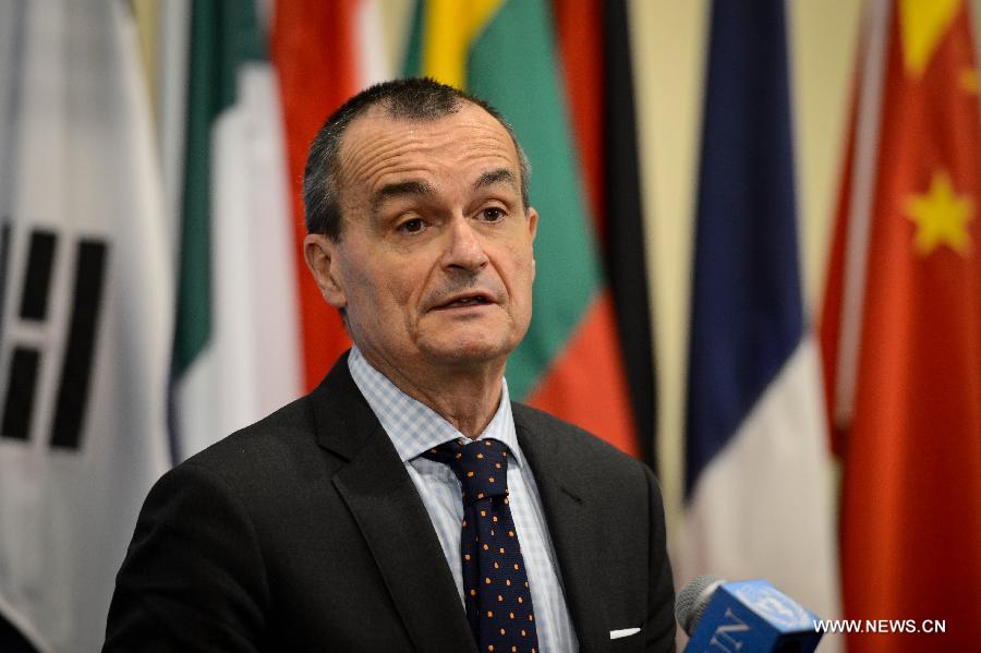 Gerard Araud, French permanent representative to the United Nations, briefs media reporters after the Security Council voted on a draft resolution on Syria, at the UN headquarters in New York, on May 22, 2014. Russia and China, two permanent members of the U.N. Security Council, on Thursday used their veto power over a draft resolution intended to refer the Syrian civil war to the International Criminal Court (ICC). (Xinhua/Niu Xiaolei)