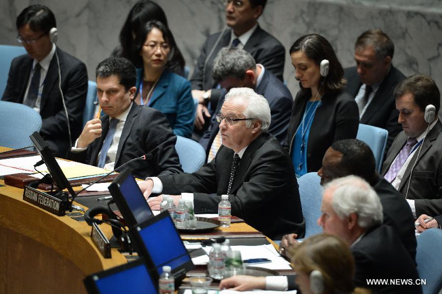 Vitaly Churkin (C), Russia's permanent representative to the United Nations, speaks after the Security Council voted on a draft resolution on Syria, at the UN headquarters in New York, on May 22, 2014. Russia and China, two permanent members of the U.N. Security Council, on Thursday used their veto power over a draft resolution intended to refer the Syrian civil war to the International Criminal Court (ICC). (Xinhua/Niu Xiaolei)