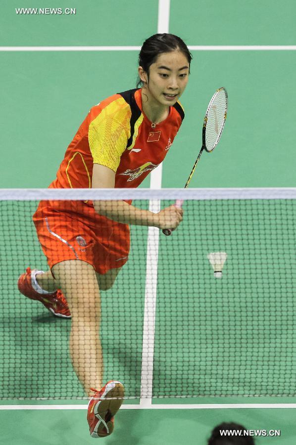 China's Wang Shixian returns a shot during the women's singles match against England's Sarah Walker in the quarter final of Uber Cup badminton championship in New Delhi May 21, 2014. Wang won the match 2-0 and China advanced to the semifinal with 3-0. (Xinhua/Zheng Huansong)