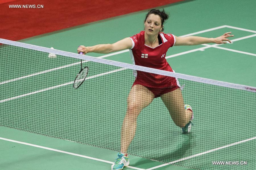 England's Sarah Walker returns a shot during the women's singles match against China's Wang Shixian in the quarter final of Uber Cup badminton championship in New Delhi May 21, 2014. Sarah Walker lost 0-2. (Xinhua/Zheng Huansong)