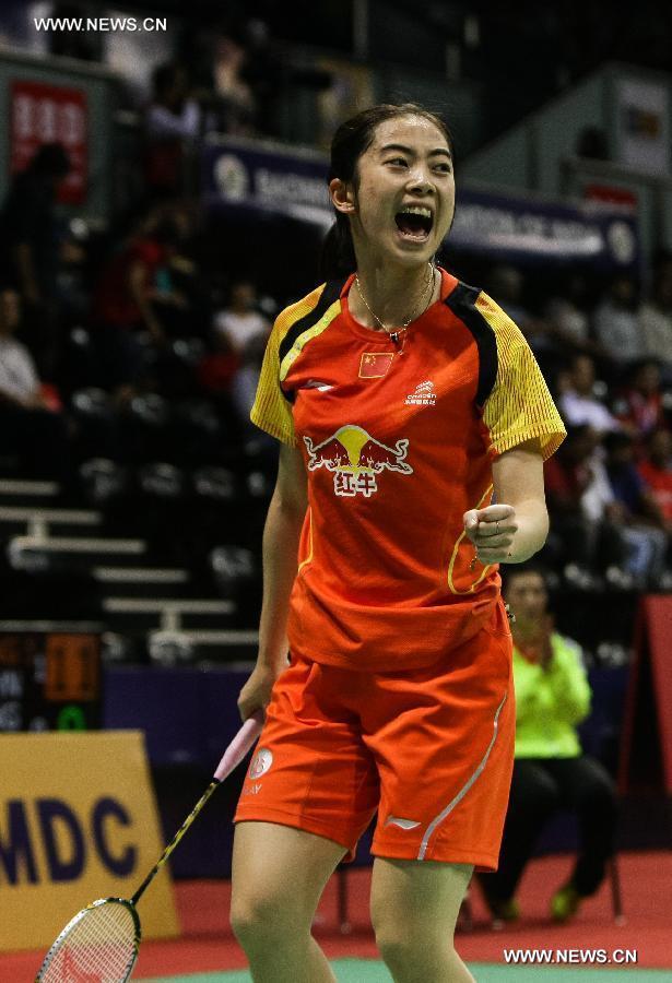 China's Wang Shixian celebrates one point during the women's singles match against England's Sarah Walker in the quarter final of Uber Cup badminton championship in New Delhi May 21, 2014. Wang won the match 2-0 and China advanced to the semifinal with 3-0. (Xinhua/Zheng Huansong)