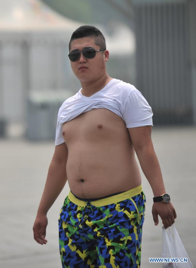 A man lifts his T-shirt to relieve summer heat in Beijing, capital of China, May 22, 2014. The highest temperature reached 35.3 degrees Celsius in Beijing on Thursday. (Xinhua/Li Wen)