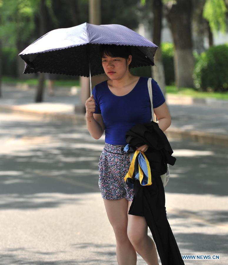 A woman holds an umbrella to shield herself from the hot sun in Beijing, capital of China, May 22, 2014. The highest temperature reached 35.3 degrees Celsius in Beijing on Thursday. (Xinhua/Li Wen)