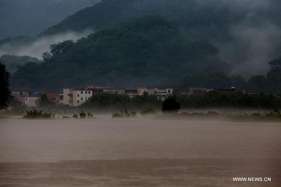 Torrential flood approaches Dubu Township in Yangshan County in Qingyuan City, south China's Guangdong Province, May 22, 2014. The city was hit by a rainstorm on May 22, causing landslide and traffic interruption in several spots. Local government has started disaster relief work. (Xinhua/Li Zuomiao)