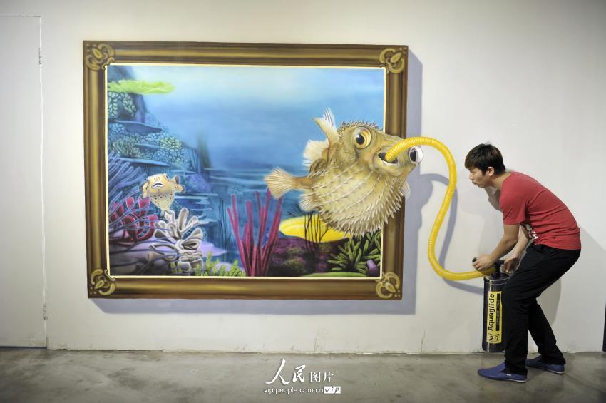 The largest 3D magic city in Asia opened in Guangzhou recently. Visitors can interact with the 3D paintings by posing with them. The photos are interesting because the 3D effect can give a transcending experience to visitors.(vip.people.com.cn/Gao Dianhua)