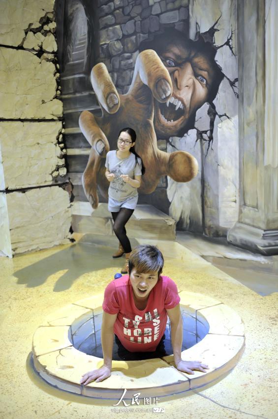 The largest 3D magic city in Asia opened in Guangzhou recently. Visitors can interact with the 3D paintings by posing with them. The photos are interesting because the 3D effect can give a transcending experience to visitors.(vip.people.com.cn/Gao Dianhua)