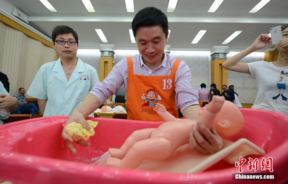 A total of 40 new and expectant fathers attend the super daddy training camp at Hunan Children's Hospital in Changsha, central China's Hunan province, May 23, 1014. They would learn baby nurturing skills in a short time under the guidance of paediatricians, including how to feed, bathe and swaddle babies and change loaded diapers.(Chinanews/Yang Huafeng)
