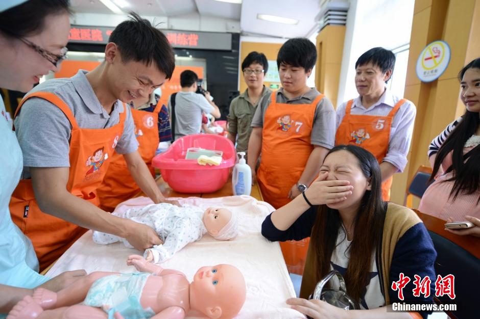 A total of 40 new and expectant fathers attend the super daddy training camp at Hunan Children's Hospital in Changsha, central China's Hunan province, May 23, 1014. They would learn baby nurturing skills in a short time under the guidance of paediatricians, including how to feed, bathe and swaddle babies and change loaded diapers.(Chinanews/Yang Huafeng)