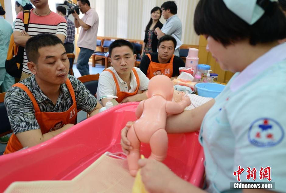 A total of 40 new and expectant fathers attend the super daddy training camp at Hunan Children's Hospital in Changsha, central China's Hunan province, May 23, 1014. They would learn baby nurturing skills in a short time under the guidance of paediatricians, including how to feed, bathe and swaddle babies and change loaded diapers.(Chinanews/Yang Huafeng)