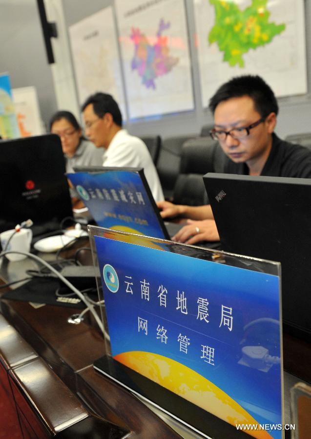 Staff members work at the Commanding Center for Earthquake Disaster Emergency of Yunnan in Kunming, capital of southwest China's Yunnan Province, on the early morning of May 24, 2014. A 5.6-magnitude earthquake jolted Yingjiang County at 4:49 a.m. Saturday (Beijing Time), according to the China Earthquake Networks Center. Five people have been injured as of 6:20 a.m. Investigations and disaster relief near the epicenter have been carried out. (Xinhua/Lin Yiguang)