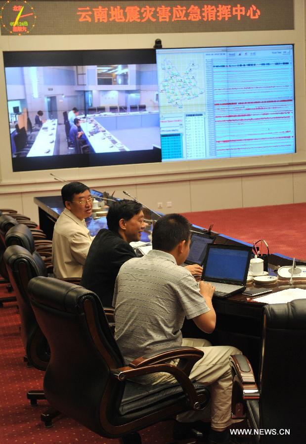 Staff members work at the Commanding Center for Earthquake Disaster Emergency of Yunnan in Kunming, capital of southwest China's Yunnan Province, on the early morning of May 24, 2014. A 5.6-magnitude earthquake jolted Yingjiang County at 4:49 a.m. Saturday (Beijing Time), according to the China Earthquake Networks Center. Five people have been injured as of 6:20 a.m. Investigations and disaster relief near the epicenter have been carried out. (Xinhua/Lin Yiguang)