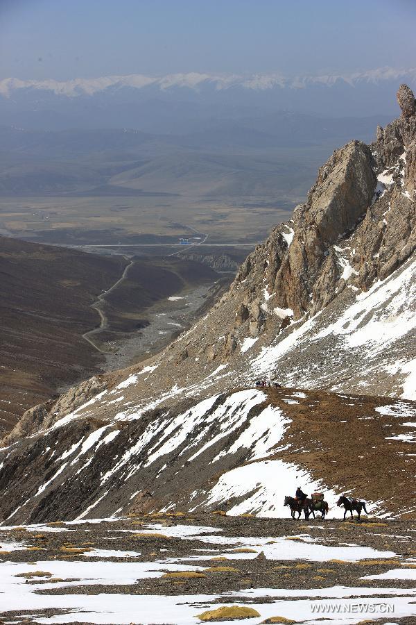 A packhorse team makes its way towards the Gangshika base camp in the Qilian Mountains in Menyuan County, northwest China's Qinghai Province, May 20, 2014. In recent years, Gangshika, the main peak of the Qilian Mountains, has become a destination for a growing number of travellers. In the nearby village of Shangdiaogou, villagers are grasping a business opportunity by providing the mountain travellers with packhorse services. In each journey, the packhorse team will carry travellers's supplies to a base camp at over 4000 meters in elevation, and bring back redundant supplies as well as garbages. (Xinhua/Guo Qiuda)