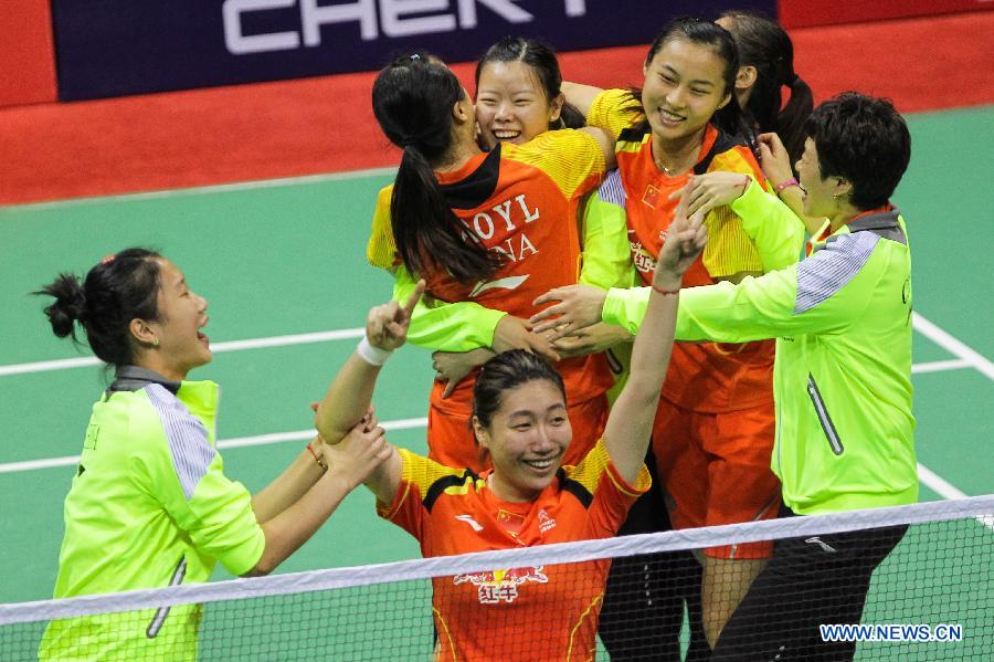 Chinese women's team celebrate after winning the final against Japan at the Uber Cup badminton championship in New Delhi, capital of India, May 24, 2014. China claimed the title of the event by beating Japan in the final 3-1. (Xinhua/Zheng Huansong)