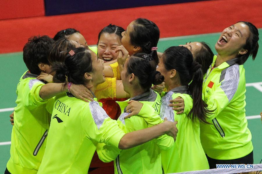 Chinese women's team celebrate after winning the final against Japan at the Uber Cup badminton championship in New Delhi, capital of India, May 24, 2014. China claimed the title of the event by beating Japan in the final 3-1. (Xinhua/Zheng Huansong)