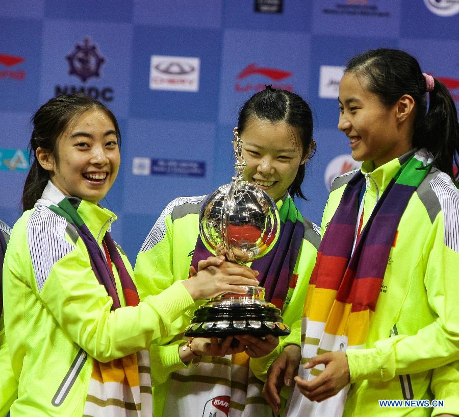 (From L to R) China's Wang Shixian, Li Xuerui and Wang Yihan celebrate with trophy during the awarding ceremony for the Uber Cup badminton championship in New Delhi, capital of India, May 24, 2014. China claimed the title of the event by beating Japan in the final 3-1. (Xinhua/Zheng Huansong)