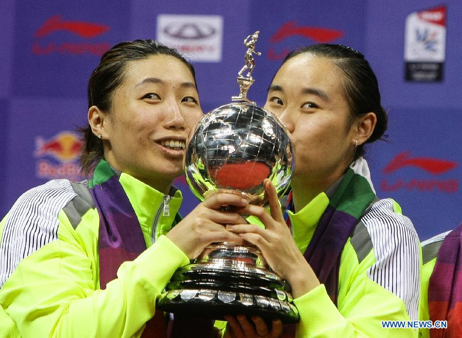 China's Wang Xiaoli (L) and Bao Yixin kiss the trophy during the awarding ceremony for the Uber Cup badminton championship in New Delhi, capital of India, May 24, 2014. China claimed the title of the event by beating Japan in the final 3-1. (Xinhua/Zheng Huansong)