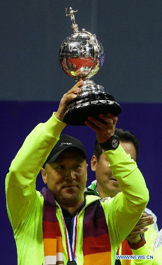China's head coach Li Yongbo celebrates with trophy during the awarding ceremony for the Uber Cup badminton championship in New Delhi, capital of India, May 24, 2014. China claimed the title of the event by beating Japan in the final 3-1. (Xinhua/Zheng Huansong)
