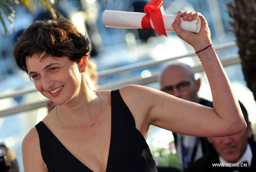 Italian director Alice Rohrwacher presents the Grand Prix of the 67th Cannes Film Festival for her film The Wonders, in Cannes, France, May 24, 2014.(Xinhua/Ye Pingfan)