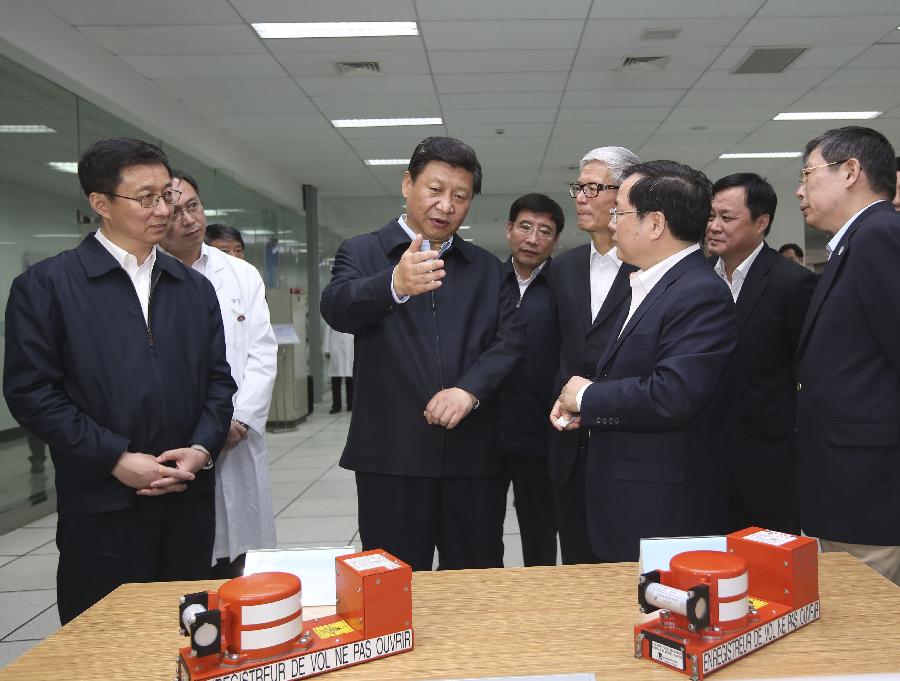 Chinese President Xi Jinping (2nd L) visits the design and research center of Commercial Aircraft Corporation of China (COMAC) during his inspection in Shanghai, east China, May 23, 2014. Xi Jinping made an inspection tour to Shanghai from Friday to Saturday. (Xinhua/Lan Hongguang)