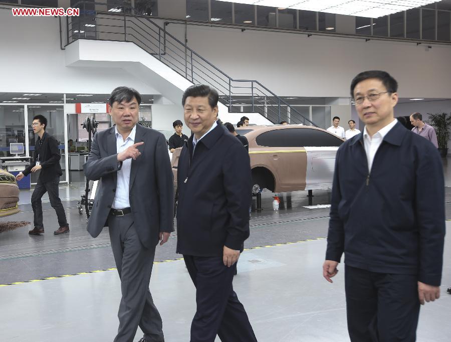 Chinese President Xi Jinping (C) visits the technology center of Shanghai Automotive Industry Corp. (SAIC MOTOR) during his inspection in Shanghai, east China, May 24, 2014. Xi Jinping made an inspection tour to Shanghai from Friday to Saturday. (Xinhua/Lan Hongguang)