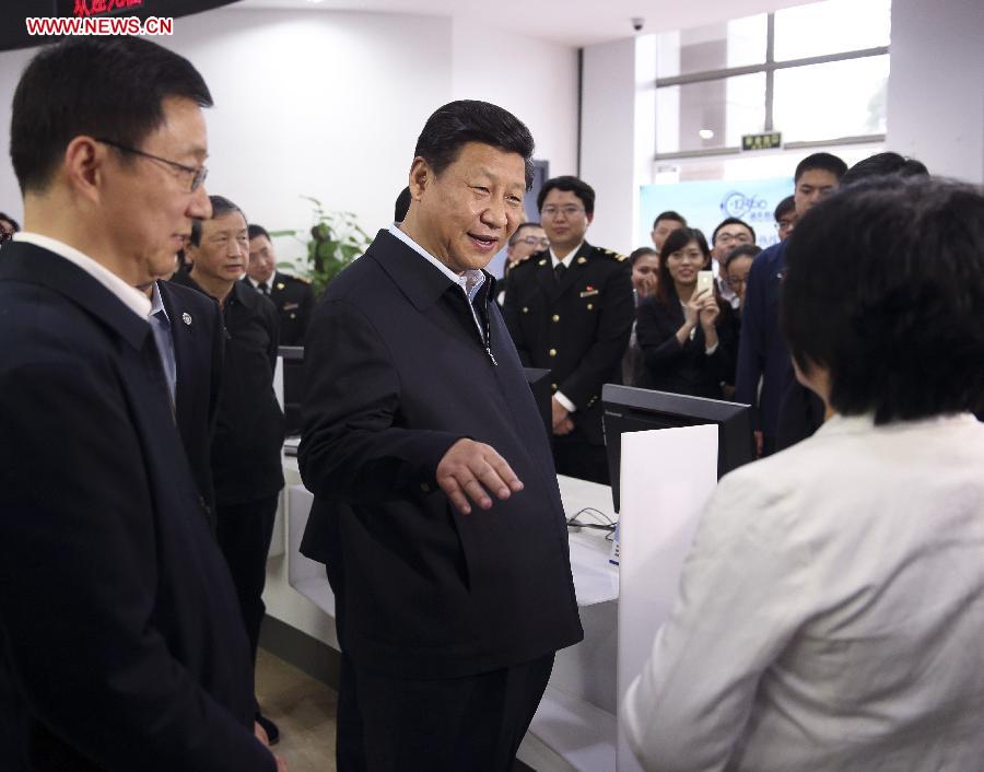 Chinese President Xi Jinping (C) talks with workers at Waigaoqiao comprehensive service hall of the China (Shanghai) Pilot Free Trade Zone (FTZ) during his inspection in Shanghai, east China, May 23, 2014. Xi Jinping made an inspection tour to Shanghai from Friday to Saturday. (Xinhua/Lan Hongguang)