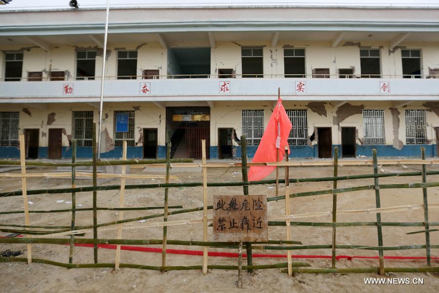 Quake-damaged teaching building of Wupai Elementary School is seen in Kachang Township of Yingjiang County, southwest China's Yunnan Province, May 24, 2014. The earthquake, which happened at 4:49 a.m. in Yingjiang County on May 24, had affected 313,000 residents in 15 towns and toppled and damaged 9,688 houses as of 7:40 p.m. The quake has also damaged 36 schools and 9 bridges. More than 10,000 people have been relocated. (Xinhua/Hao Yaxin)