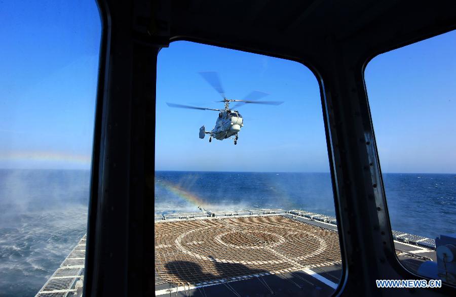 A Chinese navy helicopter takes off from China's Zhengzhou missile destroyer during the China-Russia joint naval drill on East China Sea, May 24, 2014. The three-day drill "Joint Sea-2014" ended successfully on Saturday. The Chinese and Russian navies staged exercises, including joint escort drill, joint aircraft identification exercise and air defense and maritime assault drills. (Xinhua/Zha Chunming)