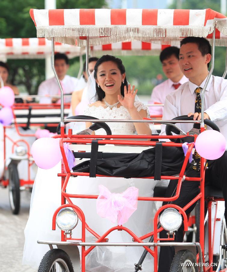 Lovers ride bicycles during a group wedding ceremony at Aixi Lake Wetland Park in Nanchang, capital of east China's Jiangxi Province, May 25, 2014. About 100 couples took part in the group wedding ceremony in which newlyweds ride bicycles to promote environmental concept. (Xinhua/Zhu Wenbiao)