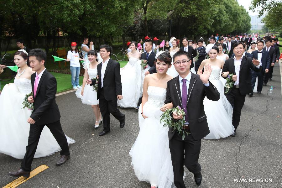 Lovers take part in a group wedding ceremony at Aixi Lake Wetland Park in Nanchang, capital of east China's Jiangxi Province, May 25, 2014. About 100 couples took part in the group wedding ceremony in which newlyweds ride bicycles to promote environmental concept. (Xinhua/Zhu Wenbiao)