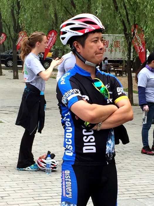 A man in professional suits finishes his ride and waits for his friends in the Climate Race on May 24, 2014. (People’s Daily Online/Gao Yinan)
