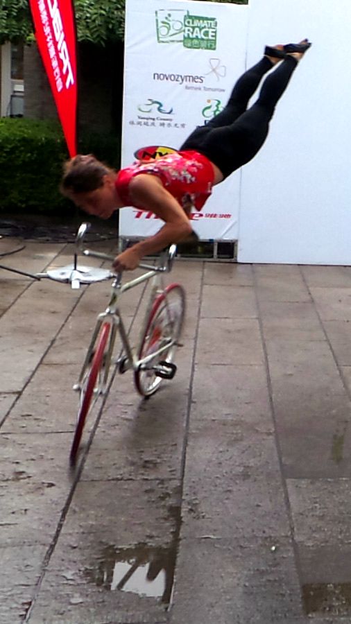 Ines Brunn performs stunts on bike. (People’ Daily Online/ Gao Yinan)