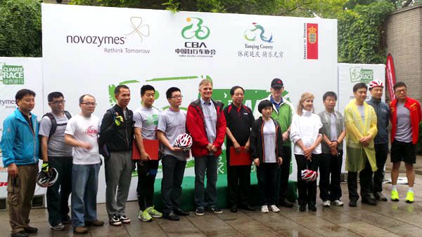 Group photo of Danish Ambassador Friis Arne Petersen and the VIP guests, including Canadian Ambassador Guy Saint-Jacques, Deputy Mayor of Yanqing County Xie Wenzheng, President of China Bicycle Association Ma Zhongchao and Head of Marketing of Novozymes China. Cui Jianfeng. (People’s Daily Onine/ Gao Yinan)