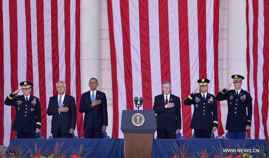U.S. President Barack Obama (3rd L), Chairman of the Joint Chiefs of Staff Army Martin Dempsey (1st L) and U.S. Secretary of Defense Chuck Hagel (2nd L) attend a Memorial Day event at Arlington National Cemetery, outside Washington D.C., the United States, May 26, 2014. (Xinhua/Yin Bogu)
