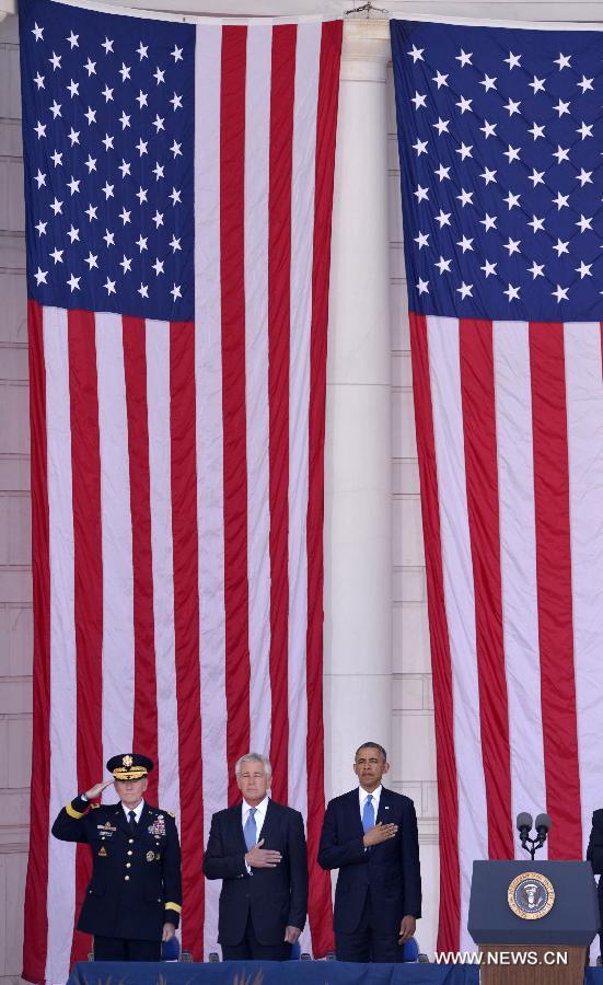 U.S. President Barack Obama (R), Chairman of the Joint Chiefs of Staff Army Martin Dempsey (L) and U.S. Secretary of Defense Chuck Hagel attend a Memorial Day event at Arlington National Cemetery, outside Washington D.C., the United States, May 26, 2014. (Xinhua/Yin Bogu)