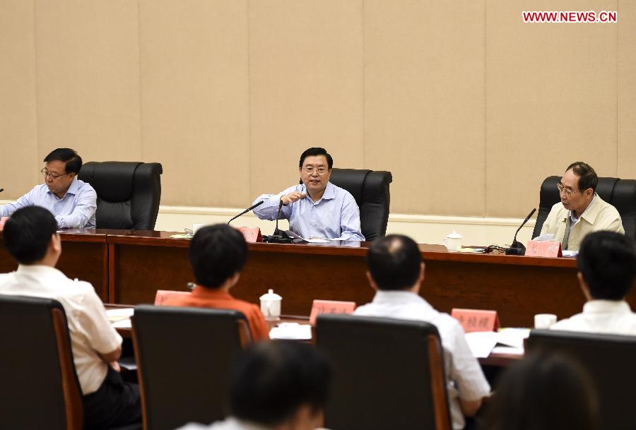 Zhang Dejiang (C, back), chairman of China's National People's Congress (NPC) Standing Committee and a member of the Standing Committee of the Political Bureau of the Communist Party of China (CPC) Central Committee, attends a meeting of the standing members of the local Party committee for the "mass line" educational campaign, in Shanghang County, southeast China's Fujian Province, May 21, 2014. The Communist Party of China (CPC) initiated the year-long campaign in June, 2013 to strengthen the "mass line", referring to a guideline under which the CPC is required to prioritize the interests of the people. (Xinhua/Li Xueren)