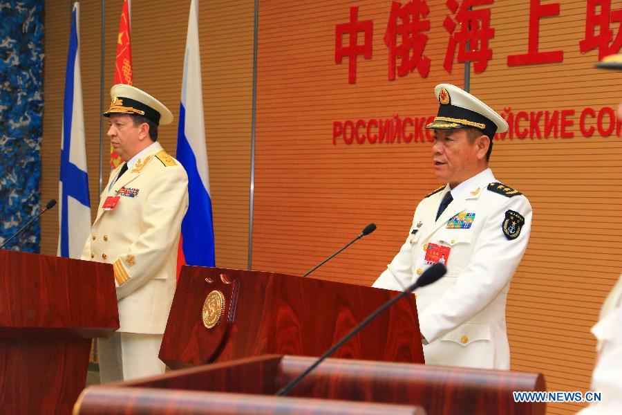 Tian Zhong (R), deputy commander of the Chinese Navy and the Chinese director of the "Joint Sea-2014", shakes hands with Fedotenkov, deputy commander of Russian Navy and Russian director of the drill, at the closing ceremony of the China-Russia joint naval drill in Shanghai, east China, May 26, 2014. The directors of two sides announced the end of the drill here on Monday. (Xinhua/Zha Chunming)