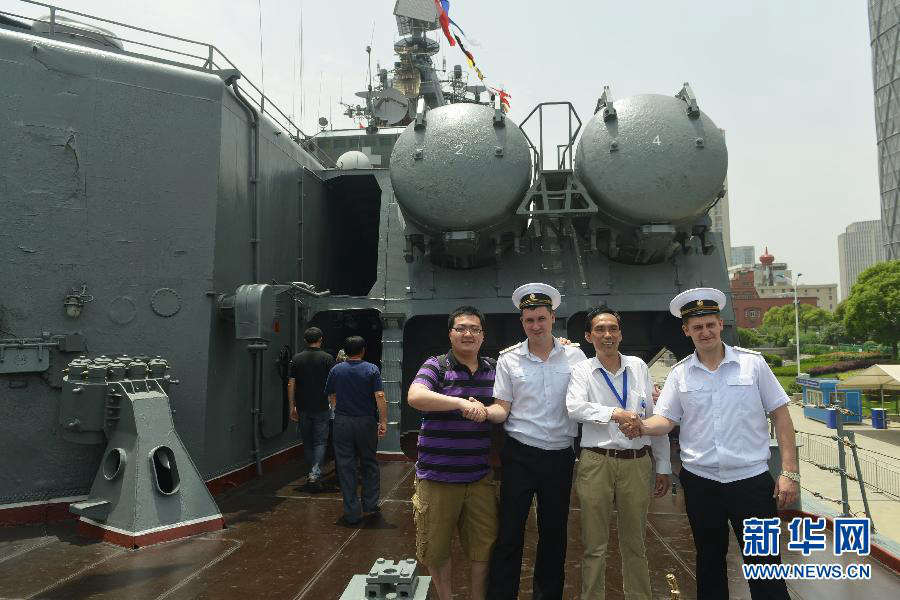 Visitors take photos with Russian crew member on board Russian guided missile cruiser Varyag on May 26, 2014. On Saturday, the Chinese and Russian navies concluded a combat drill in the East China Sea. A total of 14 warships, two submarines, nine airplanes and six helicopters from both sides took part in the three-day drill “Joint Sea-2014”. Chinese battleship Zhengzhou and Russian guided missile cruiser Varyag opened to the public on Monday at a port in Shanghai. (Xinhua News Agency/Long Wei)