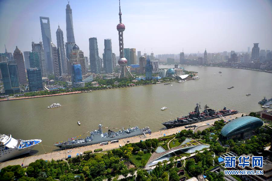 | A photo shows Chinese battleship Zhengzhou (L) and Russian guided missile cruiser Varyag (R) at a port in Shanghai on May 26, 2014. (Xinhua News Agency/Long Wei) |