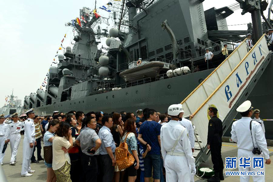 Visitors wait to board Chinese battleship Zhengzhou, shown in the background, and Russian guided missile cruiser Varyag at a port in Shanghai on May 26, 2014. (Xinhua News Agency/Long Wei)