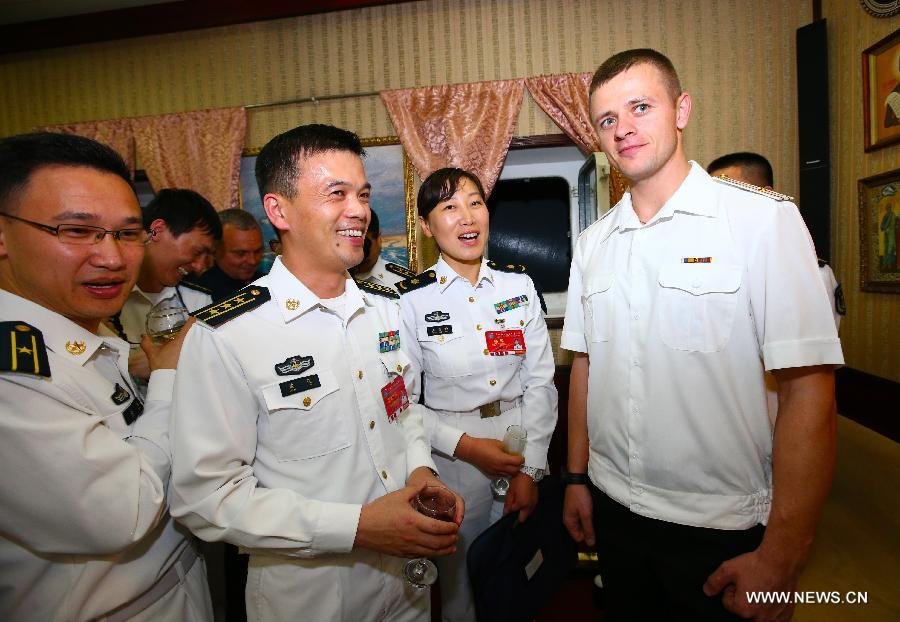 Chinese and Russian officers communicate during a reception held on the Russian guided missile cruiser Varyag in Shanghai, east China, May 19, 2014. Chinese and Russian naval forces held interchange activities on Monday to enhance mutual communication. (Xinhua/Zha Chunming)