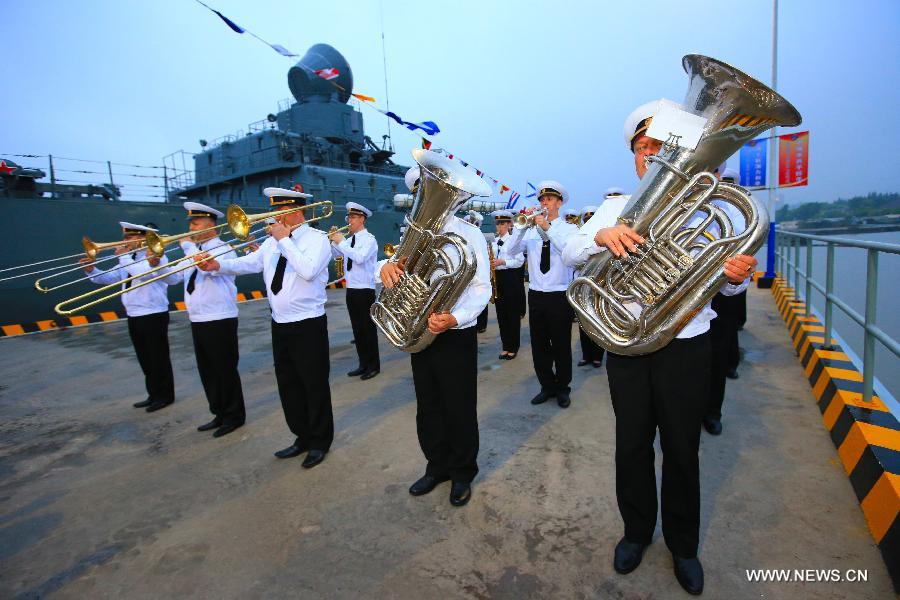 A Russian Naval Military band perform before a reception held on the Russian guided missile cruiser Varyag in Shanghai, east China, May 19, 2014. Chinese and Russian naval forces held interchange activities on Monday to enhance mutual communication. (Xinhua/Zha Chunming)