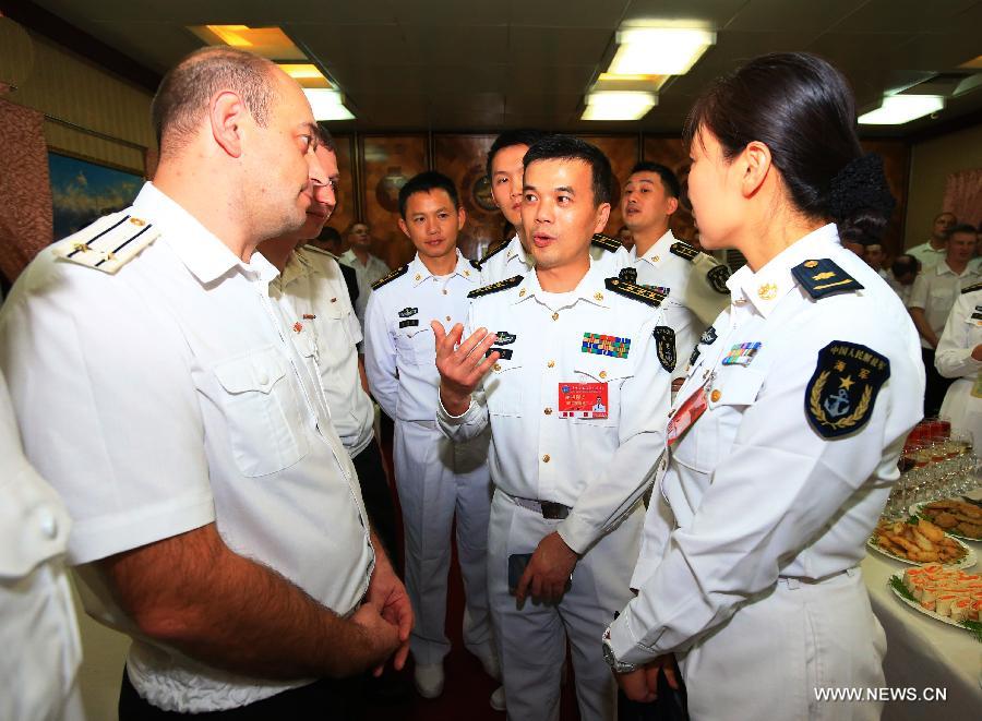 Chinese and Russian officers communicate during a reception held on the Russian guided missile cruiser Varyag in Shanghai, east China, May 19, 2014. Chinese and Russian naval forces held interchange activities on Monday to enhance mutual communication. (Xinhua/Zha Chunming)