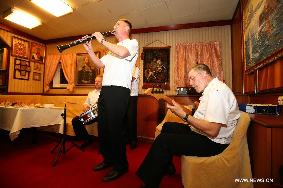A band performs during a reception held on the Russian guided missile cruiser Varyag in Shanghai, east China, May 19, 2014. Chinese and Russian naval forces held interchange activities on Monday to enhance mutual communication. (Xinhua/Zha Chunming)