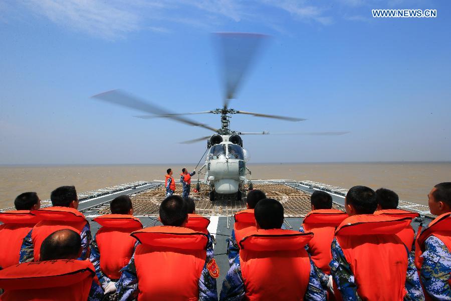 Ground crew members wash the engine of a helicopter on China's Zhengzhou missile destroyer, East China Sea, May 22, 2014. Naval ships from China and Russia left Shanghai for the East China Sea to take part in the "Joint Sea-2014" exercise on Thursday. (Xinhua/Zha Chunming)