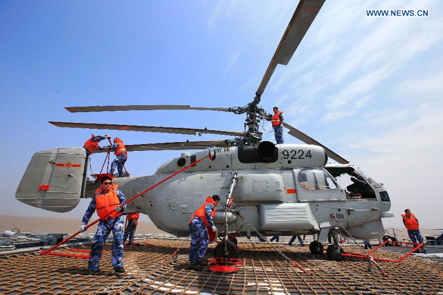 Crew members work on a helicopter on China's Zhengzhou missile destroyer, East China Sea, May 22, 2014. Naval ships from China and Russia left Shanghai for the East China Sea to take part in the "Joint Sea-2014" exercise on Thursday. (Xinhua/Zha Chunming)