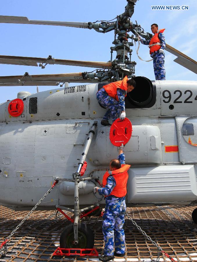 Crew members work on a helicopter on China's Zhengzhou missile destroyer, East China Sea, May 22, 2014. Naval ships from China and Russia left Shanghai for the East China Sea to take part in the "Joint Sea-2014" exercise on Thursday. (Xinhua/Zha Chunming)