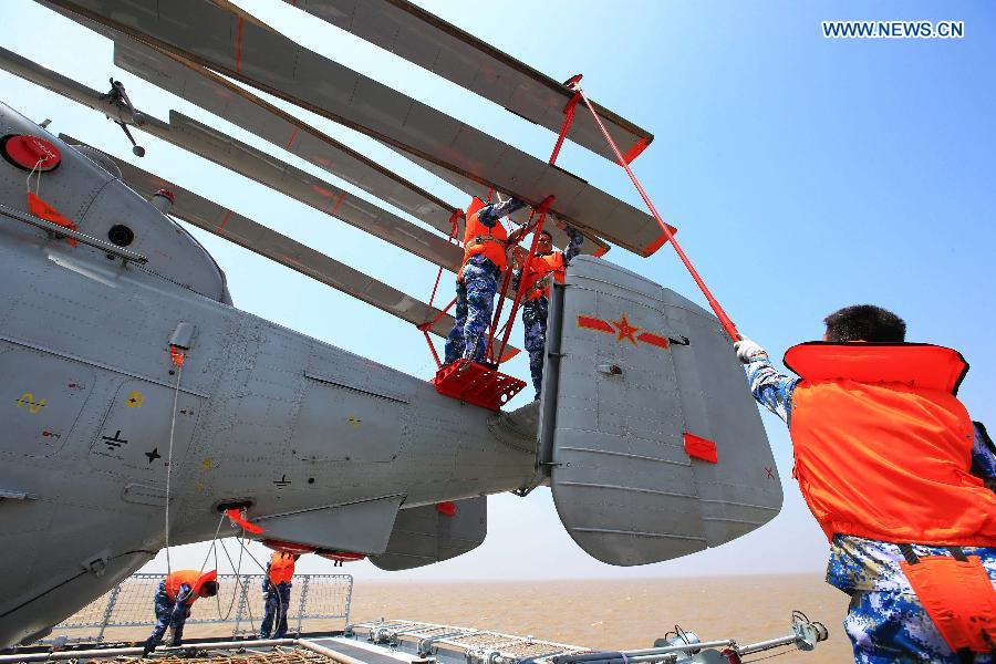 Crew members work by a helicopter on China's Zhengzhou missile destroyer, East China Sea, May 22, 2014. Naval ships from China and Russia left Shanghai for the East China Sea to take part in the "Joint Sea-2014" exercise on Thursday. (Xinhua/Zha Chunming)
