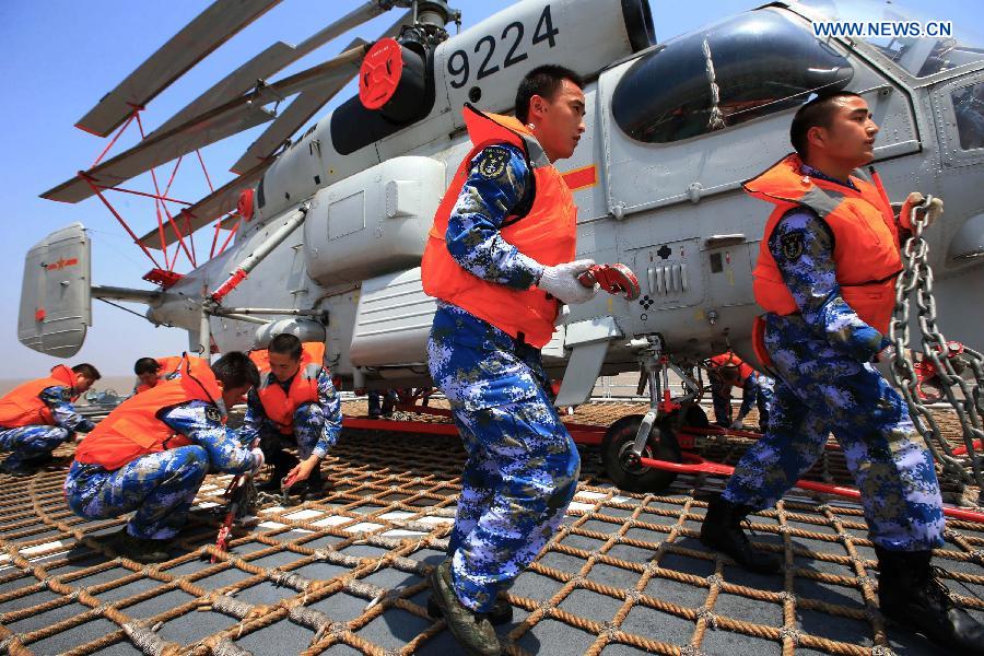 Crew members prepare to put the helicopter into hangar on China's Zhengzhou missile destroyer, East China Sea, May 22, 2014. Naval ships from China and Russia left Shanghai for the East China Sea to take part in the "Joint Sea-2014" exercise on Thursday. (Xinhua/Zha Chunming)